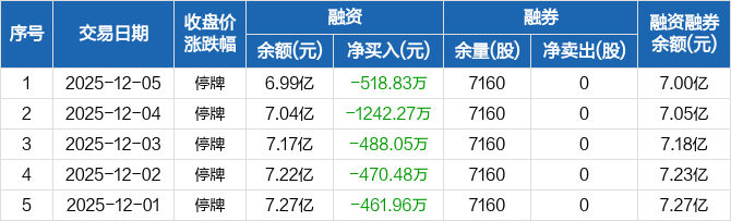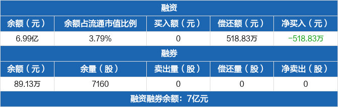 融资方面,当日融资买入0元,融资偿还518.83万元,融资净偿还518.83万元,连续12日净偿还累计3.65亿元。融券方面,融券卖出0股,融券偿还0股,融券余量7160股,融券余额89.13万元。融资融券余额合计7亿元。