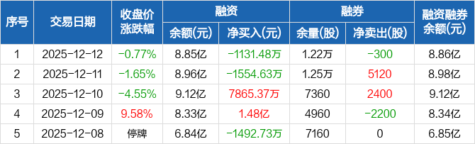 普冉股份:融资净偿还1131.48万元,融资余额8.85亿元(12-12)