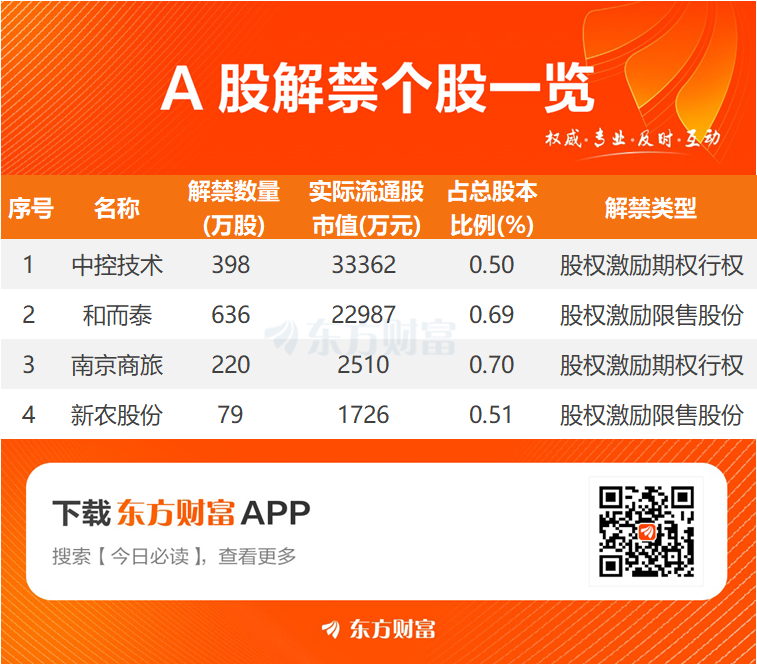 从解禁市值看,东方财富Choice数据显示,明日面临解禁的4只股票中,中控技术、和而泰、南京商旅居前,解禁市值分别为3.34亿元、2.30亿元、0.25亿元。解禁比例方面,南京商旅、和而泰、新农股份分别为0.70%、0.69%、0.51%,居于前列。