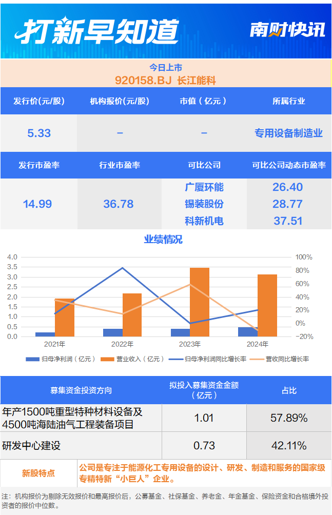 长江能科是一家专注于能源化工专用设备的设计、研发、制造和服务的国家级专精特新“小巨人”企业,主要产品包括电脱设备、分离设备、换热设备、存储设备、固碳设备、氢能设备等能源化工专用设备以及助剂和技术服务,广泛应用于油气工程、炼油化工、海洋工程、清洁能源等领域。