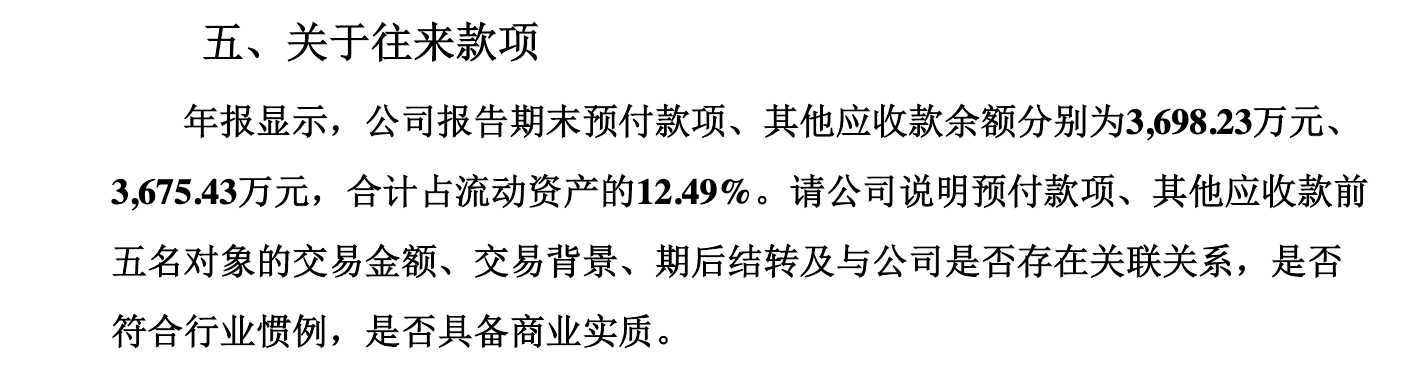 在2024年6月份的2023年报问询函中,上交所就提及公司支付“预付账款、其他应收款占流动资产过高”,预付账款前五名交易对象与公司是否存在关联关系。