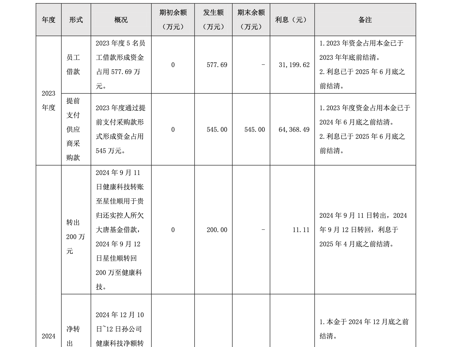 而在2025年7月份的问询函中载明,2024年9月,倍轻松转出200万元至实控人施加重大影响的企业星佳顺贸易公司账户下,形成实控人资金占用;2024年12月10日-12日,倍轻松公司累计净转出5200万元至星佳顺,本金和利息在2024年12月和2025年4月底前结清。