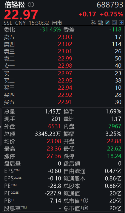 截至今日收盘,倍轻松股价报收22.97元/股,上涨0.75%。