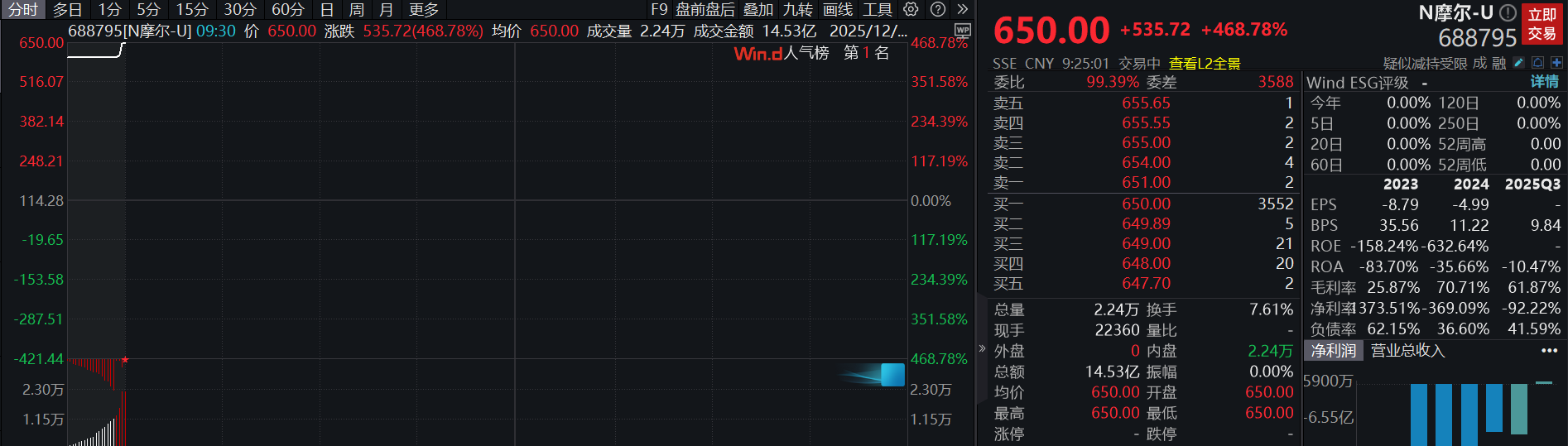 12月5日,摩尔线程在科创板上市,该股竞价高开超468%,总市值近3055亿,股价报650元,单签盈利高达26.786万元。