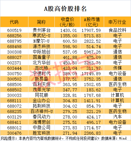 12月5日,N摩尔-U(即摩尔线程)登陆科创板,该股开盘涨幅达到468.8%,A股市值直接飙升至3000亿元以上。截至今日收盘,公司股价报收600.5元/股,取代源杰科技,成为当前A股第三高价股。排在前两位的是贵州茅台、寒武纪-U。