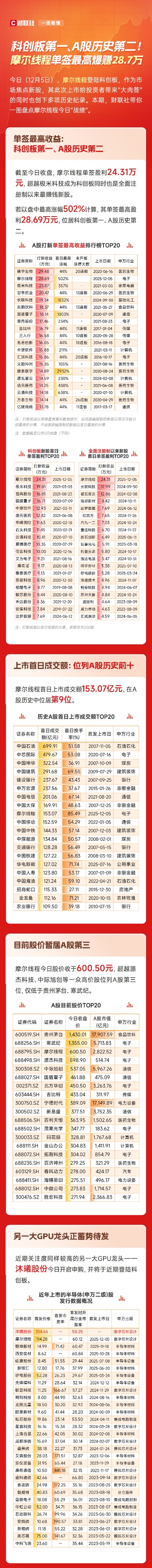 一图看懂:摩尔线程单签最高盈利28.7万 股价站稳600元位居A股第三