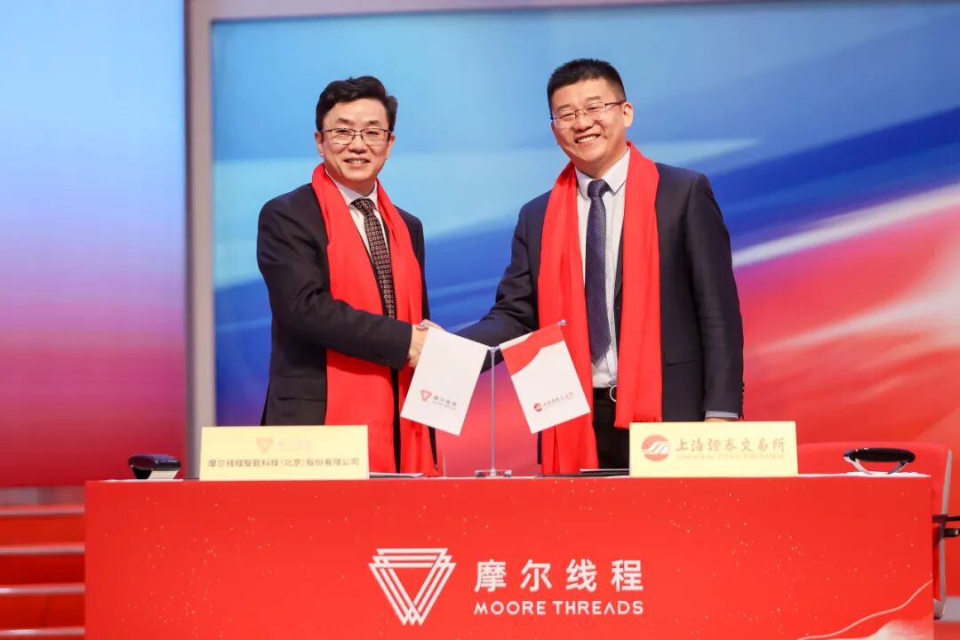 上市仪式上,上海证券交易所副总经理吕昊,摩尔线程创始人、董事长兼总经理张建中签订了公司科创板证券上市协议,并代表双方互赠纪念品。