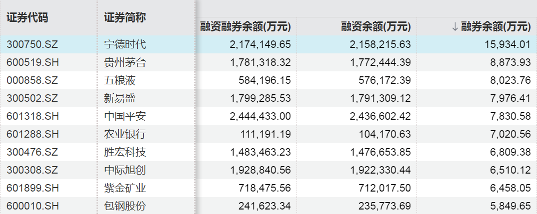 Wind数据显示,截至12月5日,A股市场融券余额居前的股票分别为宁德时代、贵州茅台、五粮液,融券余额分别为1.59亿元、0.89亿元、0.80亿元。