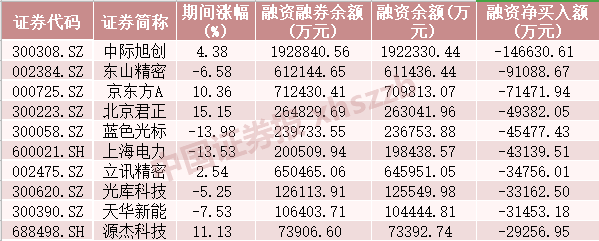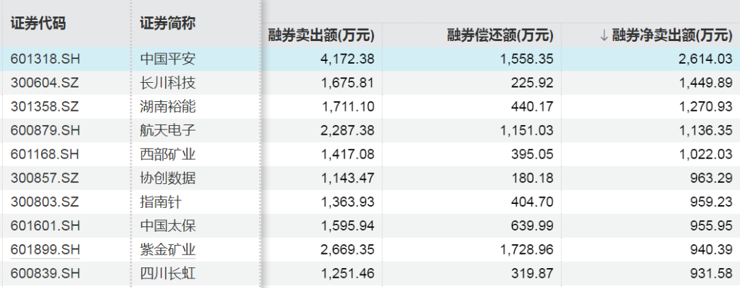 上周融券净卖出额前十股票