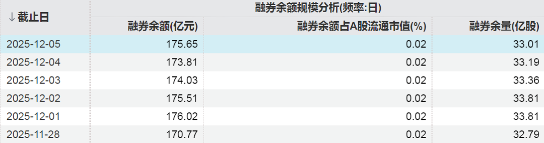 Wind数据显示,截至12月5日,A股市场融券余额为175.65亿元,融券余量为33.01亿股。