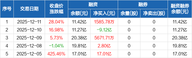 融资方面,当日融资买入9.57亿元,融资偿还9.41亿元,融资净买入1585.78万元。融券方面,融券卖出0股,融券偿还0股,融券余量0股,融券余额0元。融资融券余额合计11.42亿元。