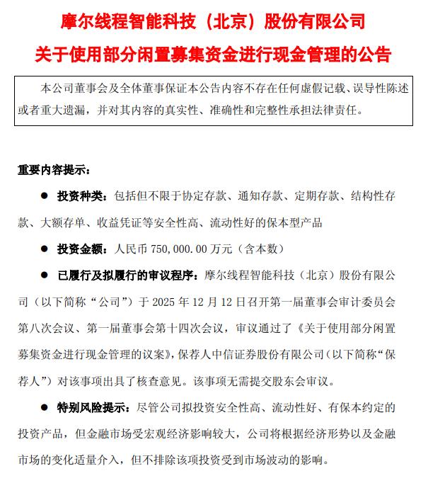 摩尔线程:拟使用最高不超75亿闲置募集资金进行现金管理