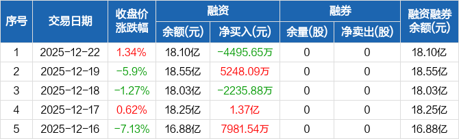融资方面,当日融资买入3.57亿元,融资偿还4.02亿元,融资净偿还4495.65万元。融券方面,融券卖出0股,融券偿还0股,融券余量0股,融券余额0元。融资融券余额合计18.1亿元。
