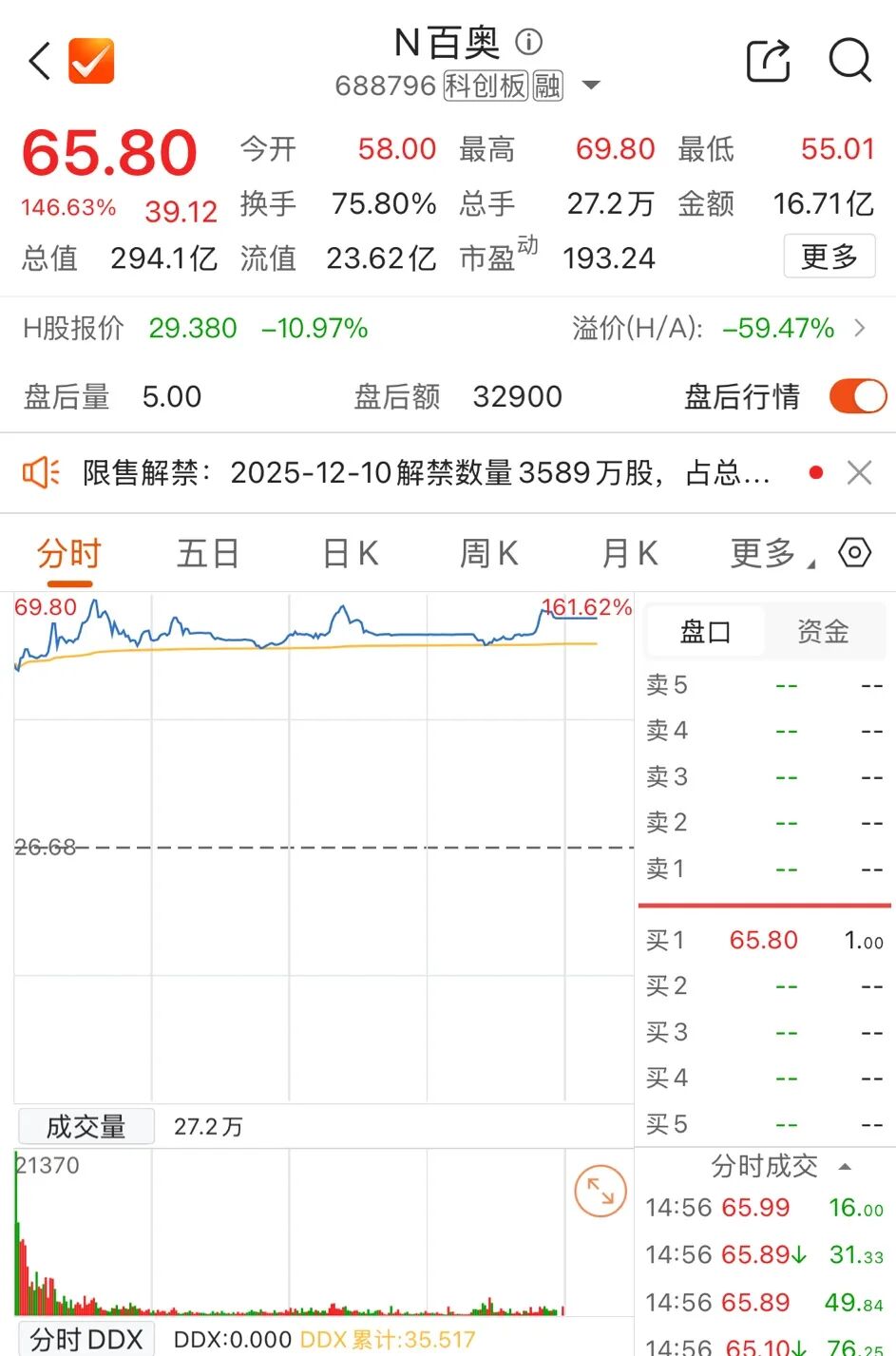 百奥赛图发行价26.68元/股,开盘价58元/股,高开117.4%,随后股价继续上扬,盘中一度涨超160%。截至12月10日收盘,公司股价报65.8元/股,上涨146.63%,总市值达294.06亿元。