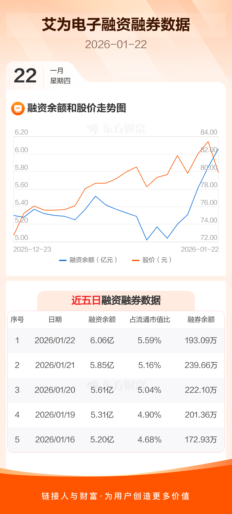 交易所最新数据显示,艾为电子于2026年1月22日获融资买入9282.38万元,融资偿还6810.64万元,当日融资净买入2471.73万元。目前,该股融资余额6.06亿,占流通市值比例为5.59%。