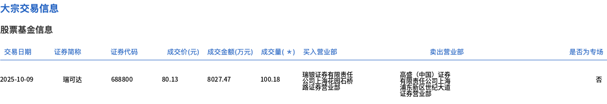 瑞可达今日大宗交易平价成交100.18万股,成交额8027.47万元