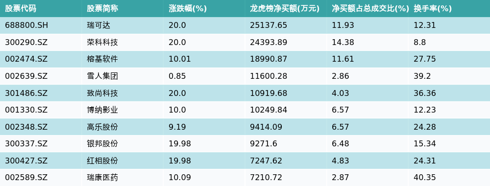 南财智讯12月8日电,南财金融终端数据显示,因当日异动登上龙虎榜的个股中,资金净买入最多的前三位分别是瑞可达(688800.SH)、荣科科技(300290.SZ)与榕基软件(002474.SZ)。其中排名第一的瑞可达净买额达2.51亿元,占总成交金额的11.93%。瑞可达当日收盘上涨20.0%,换手率为12.31%,净买入额前10个股详情见下图: