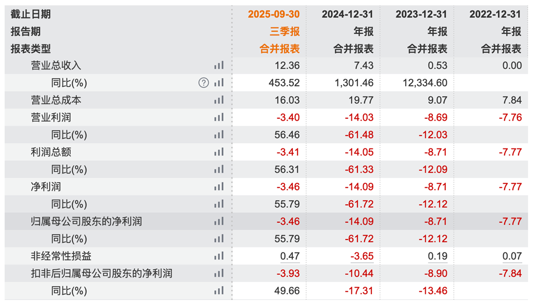 然而,营收飙升的背后是持续扩大的亏损。2022年至2024年,公司归母净利润分别为-7.77亿元、-8.71亿元和-14.09亿元,累计亏损额高达30.57亿元。2025年前三季度,公司亏损额为3.46亿元,虽较同期减亏55.79%,但依然未能扭转亏损局面。
