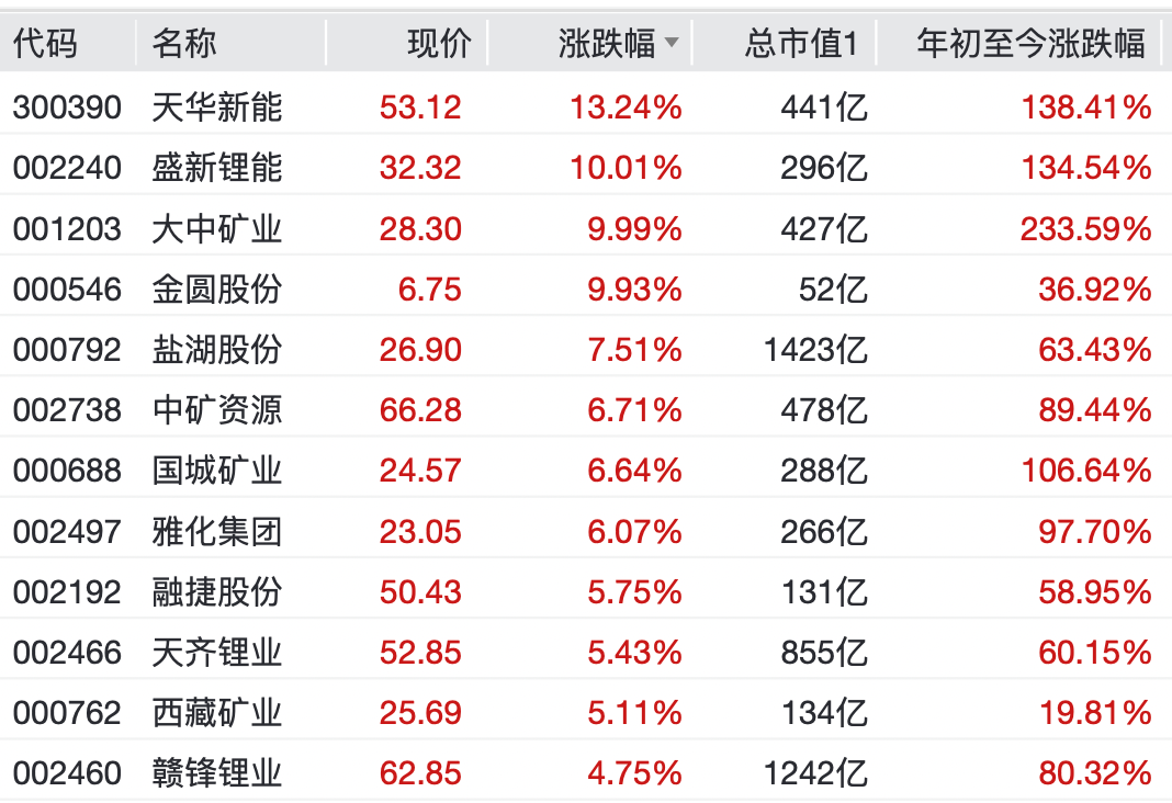 个股方面,盛新锂能、大中矿业、金圆股份录得10cm涨停,盐湖股份涨超7%,赣锋锂业涨超4%,天齐锂业涨超5%,天华新能涨超13%。国城矿业、中矿资源、雅化集团、融捷股份、西藏矿业等均涨超5%。