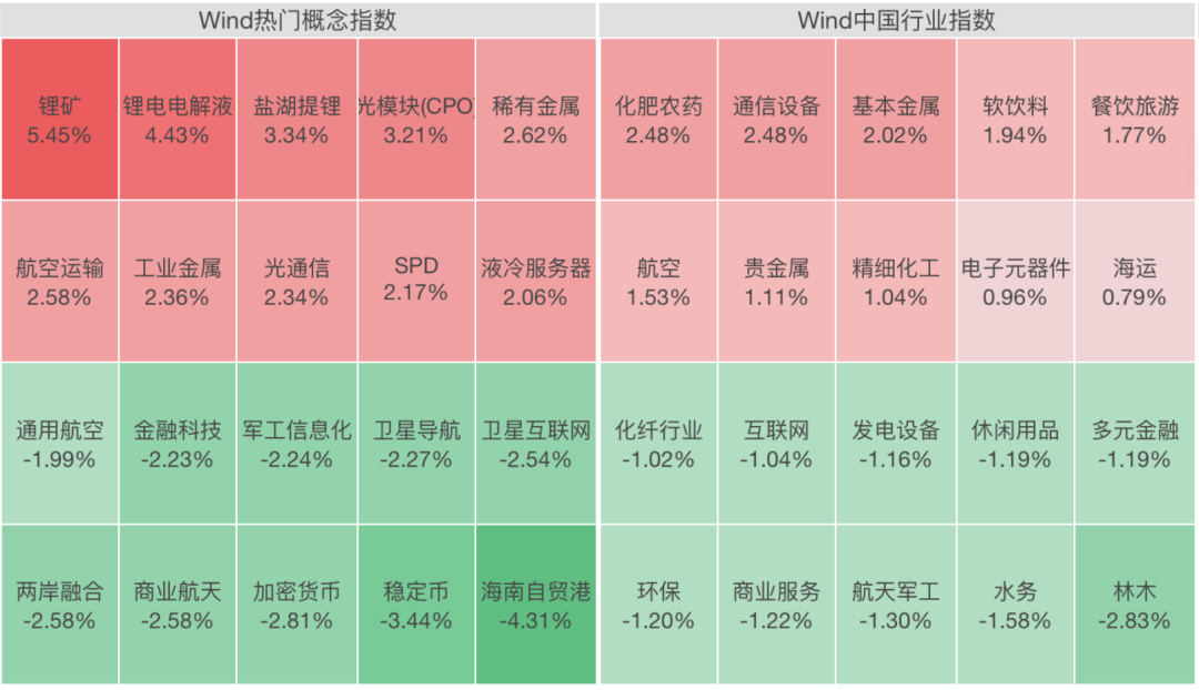 从板块看,大科技集体反弹,锂矿、CPO概念股走高,通信设备、化肥农药、旅游酒店板块涨幅居前;而此前上涨幅度较大的海南自贸区、商业航天等概念板块下挫。
