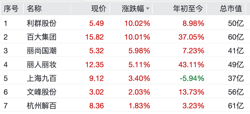 个股方面,利群股份、百大集团录得10cm涨停,丽尚国潮、丽人丽妆、上海九百、文峰股份等均跟涨。