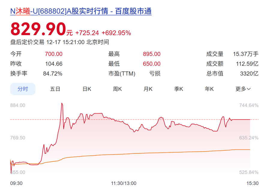 今日,“国产GPU第二股”沐曦股份正式在科创板上市,股价一路冲高,热度堪比摩尔线程。上市首日最高股价达895元,收盘时收于829.9元,市值突破3320亿元。若按最高股价计算,中签(500股)的投资者可赚近40万元。