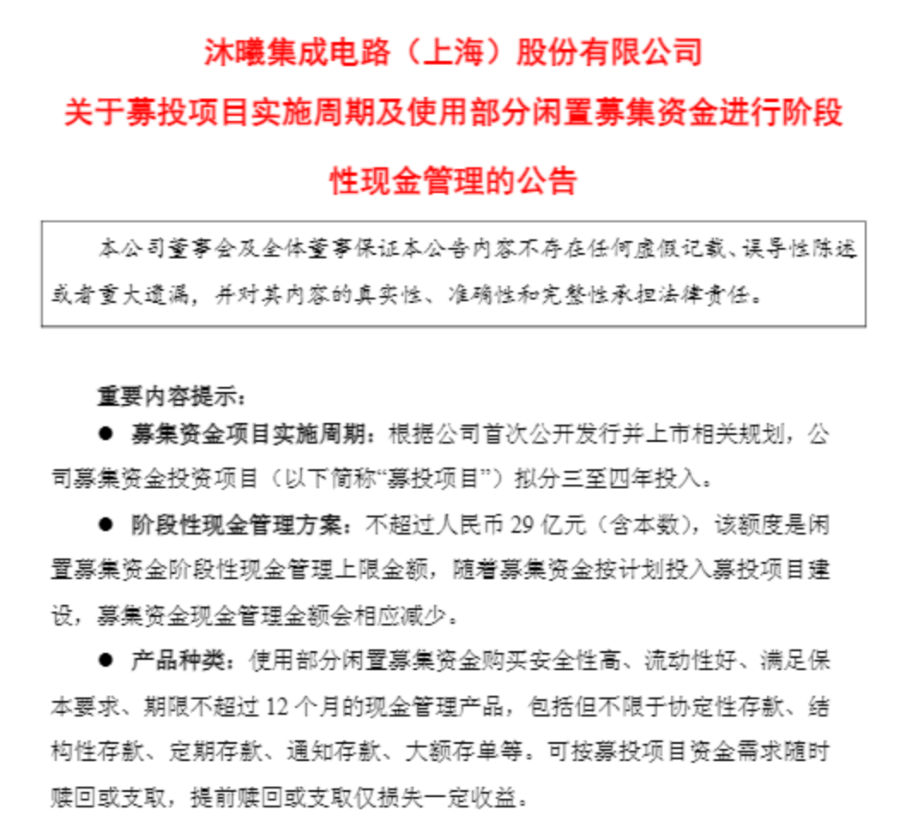 事实上,对于研发周期长、资金投入分阶段的集成电路企业而言,对闲置募集资金进行现金管理的操作并不少见。