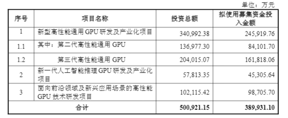 据公司公告,首次公开发行的募投项目及募集资金使用计划包括,新型高性能通用GPU研发及产业化项目、新一代人工智能推理GPU研发及产业化项目以及面向前沿领域及新兴应用场景的高性能GPU技术研发项目。具体募投项目及募集资金使用计划如下: