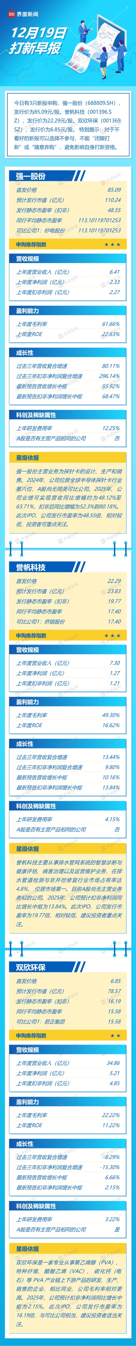 今日有3只新股申购,强一股份(688809.SH),发行价为85.09元/股。誉帆科技(001396.SZ),发行价为22.29元/股。双欣环保(001369.SZ),发行价为6.85元/股。