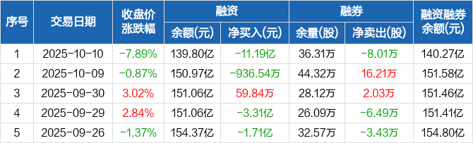 中芯国际融资融券信息显示,2025年10月10日融资净偿还11.19亿元;融资余额139.8亿元,较前一日下降7.4%。