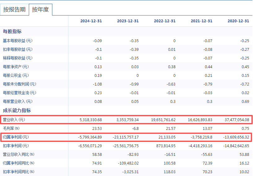 业绩方面,公司营收近五年来有所波动,但整体出现下滑,由2020年的3748万元降至2024年的532万元;净利润则连续两年亏损,2023年由上年的2万元同比大幅转亏至-2312万元,去年继续亏损580万元。