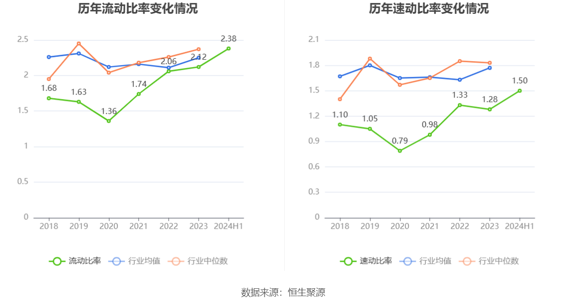 2024年上半年,公司流动比率为2.38,速动比率为1.50。