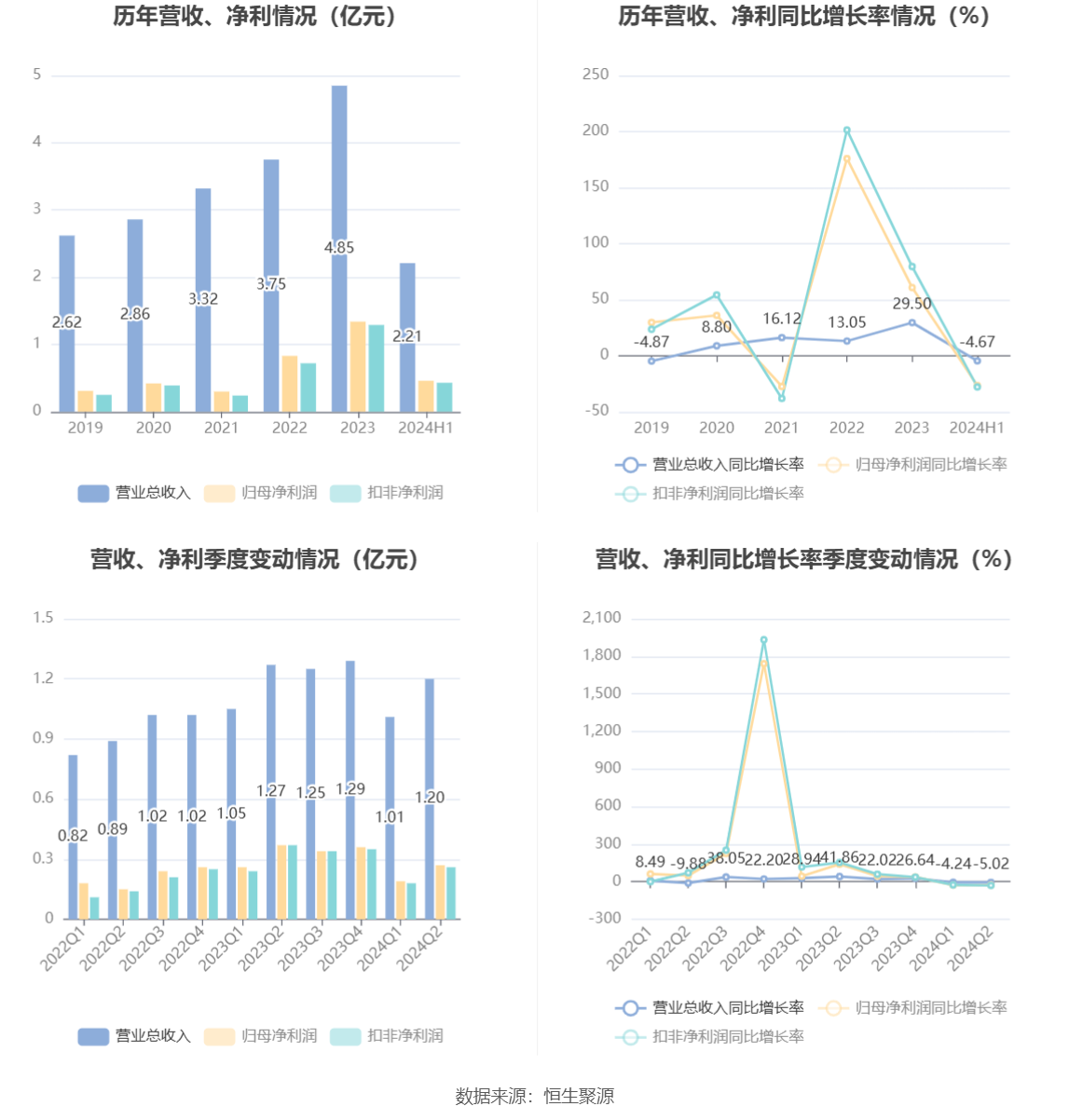 根据半年报,公司第二季度实现营业总收入1.2亿元,同比下降5.02%,环比增长19.07%;归母净利润2711.55万元,同比下降26.79%,环比增长41.61%;扣非净利润2569.02万元,同比下降29.78%,环比增长45.38%。