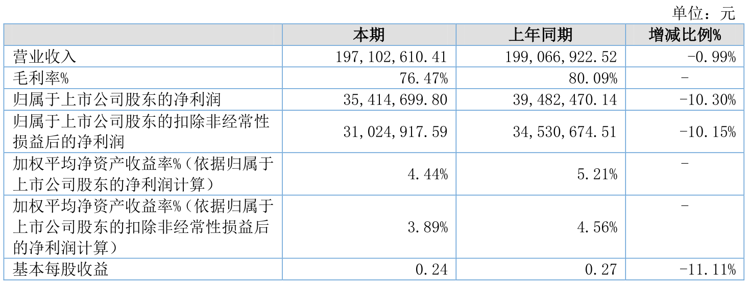 中证智能财讯梓橦宫(832566)8月25日披露2025年半年度报告。2025年上半年,公司实现营业总收入1.97亿元,同比下降0.99%;归母净利润3541.47万元,同比下降10.30%;扣非净利润3102.49万元,同比下降10.15%;经营活动产生的现金流量净额为5459.83万元,同比增长46.88%;报告期内,梓橦宫基本每股收益为0.24元,加权平均净资产收益率为4.44%。