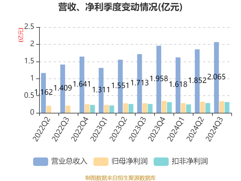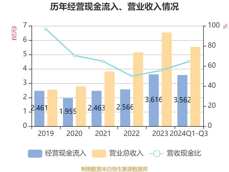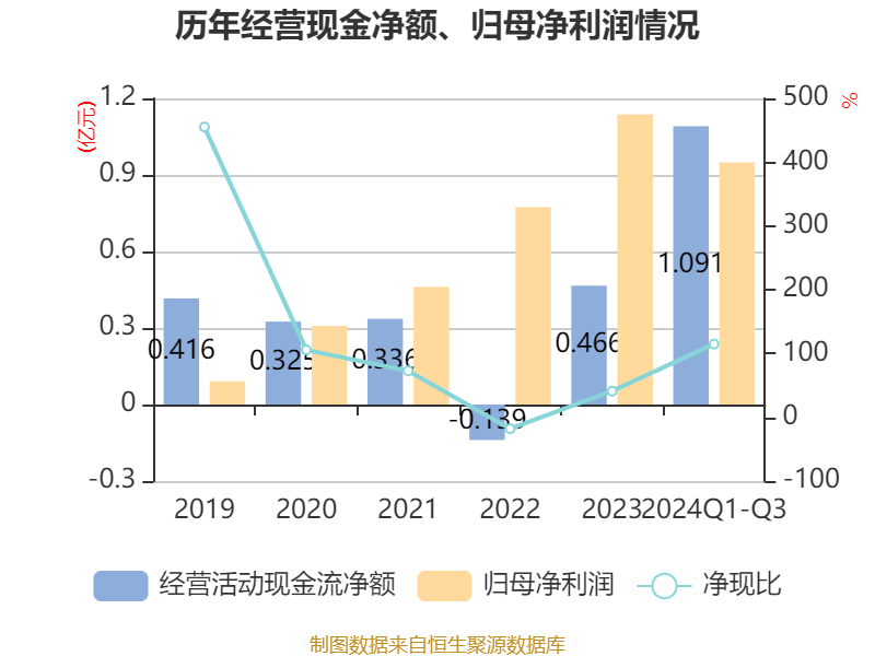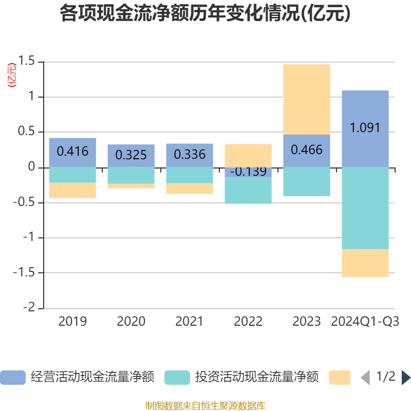 2024年前三季度,公司经营活动现金流净额为1.09亿元,同比增长636.01%;筹资活动现金流净额-3946.49万元,同比减少1.75亿元;投资活动现金流净额-1.16亿元,上年同期为-2055.39万元。