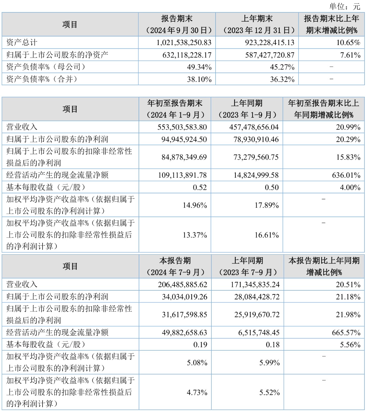 中证智能财讯开特股份(832978)10月30日披露2024年第三季度报告。前三季度公司实现营业收入5.54亿元,同比增长20.99%;归母净利润9494.59万元,同比增长20.29%;扣非净利润8487.83万元,同比增长15.83%;经营活动产生的现金流量净额为1.09亿元,同比增长636.01%;报告期内,开特股份基本每股收益为0.52元,加权平均净资产收益率为14.96%。