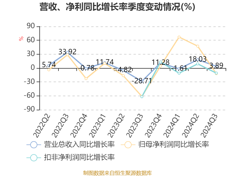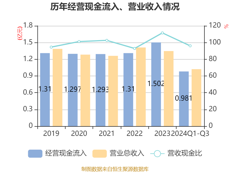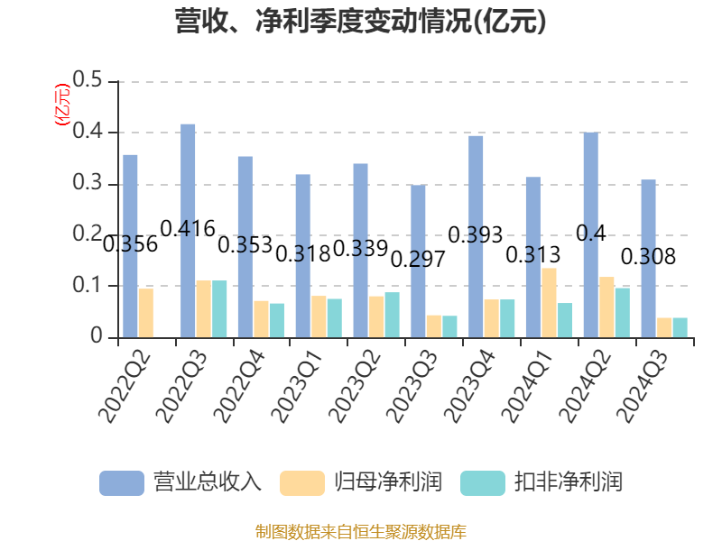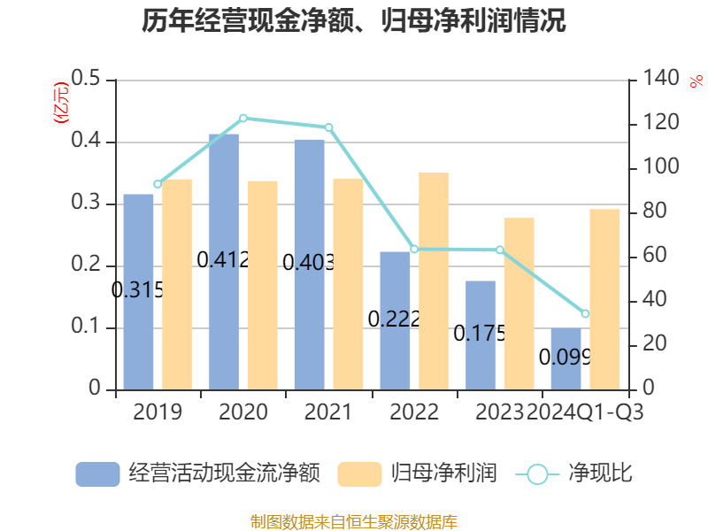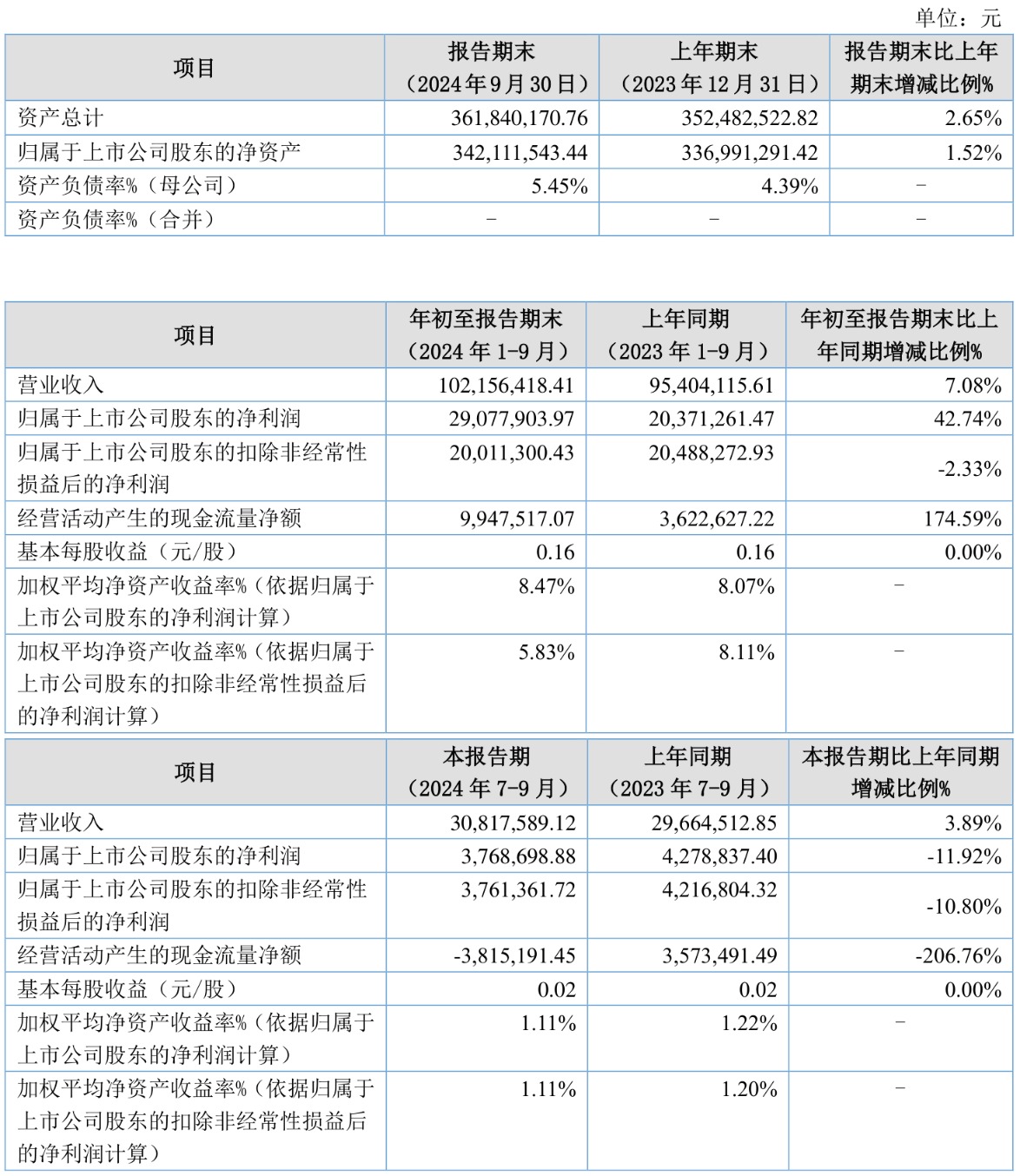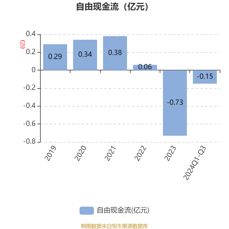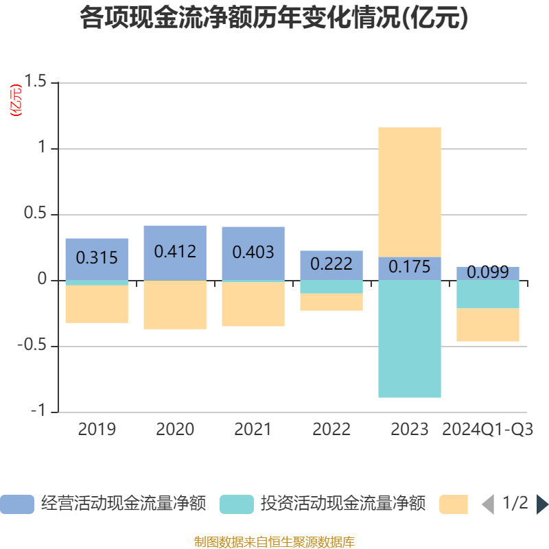 2024年前三季度,公司经营活动现金流净额为994.75万元,同比增长174.59%;筹资活动现金流净额-2503.67万元,同比减少1.37亿元;投资活动现金流净额-2160.43万元,上年同期为-1.18亿元。