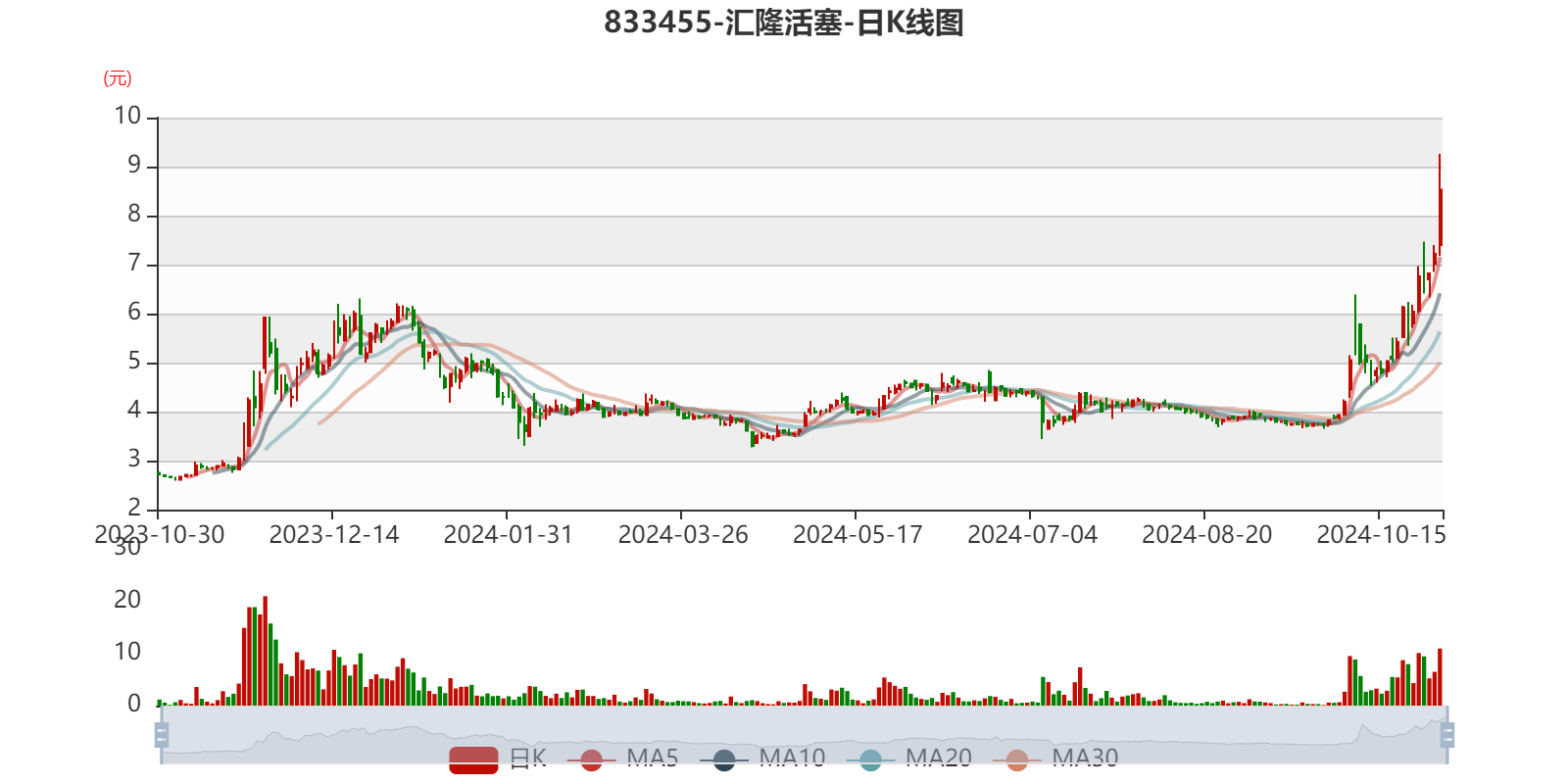 以10月30日收盘价计算,汇隆活塞目前市盈率(TTM)约为41.54倍,市净率(LF)约4.42倍,市销率(TTM)约10.7倍。