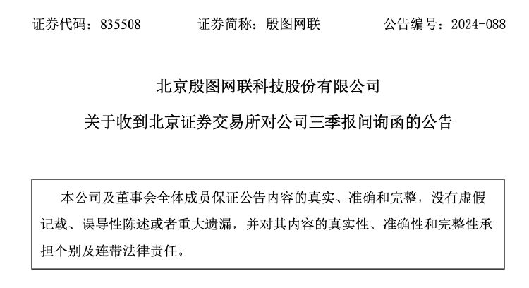 11月6日,殷图网发布公告称,收到北交所对公司三季报的问询函。北交所就公司的经营业绩、研发费用、存货,以及股价上涨等四个方面进行问询。