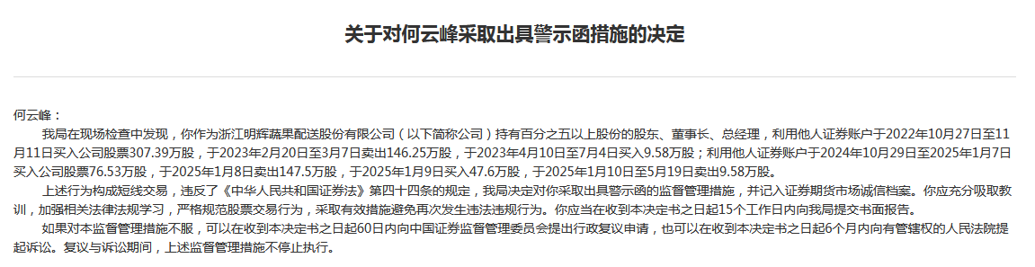 浙江证监局在现场检查中发现,何云峰作为浙江明辉蔬果配送股份有限公司(以下简称公司)持有百分之五以上股份的股东、董事长、总经理,利用他人证券账户于2022年10月27日至11月11日买入公司股票307.39万股,于2023年2月20日至3月7日卖出146.25万股,于2023年4月10日至7月4日买入9.58万股;利用他人证券账户于2024年10月29日至2025年1月7日买入公司股票76.53万股,于2025年1月8日卖出147.5万股,于2025年1月9日买入47.6万股,于2025年1月10日至5月19日卖出9.58万股。