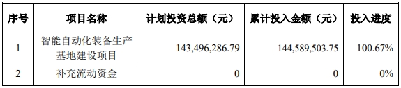 日前,春光智能(838810)发布公告,宣布将“智能自动化装备生产基地建设项目”延期至2025年11月30日。该项目募集资金投入进度为100.67%,累计投入金额1.45亿元。