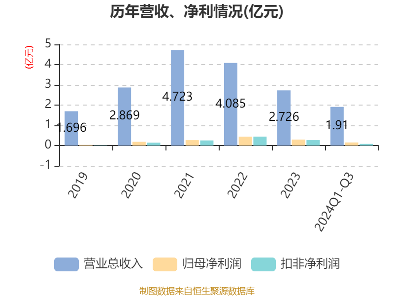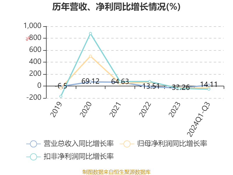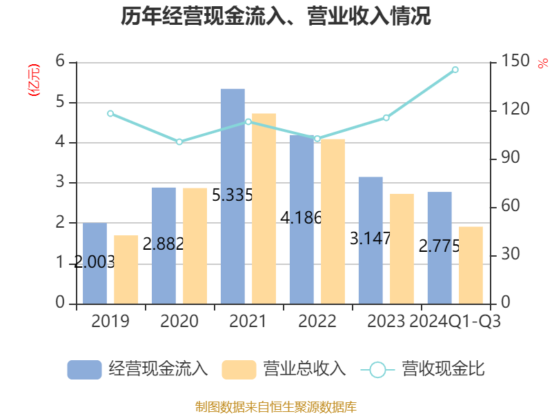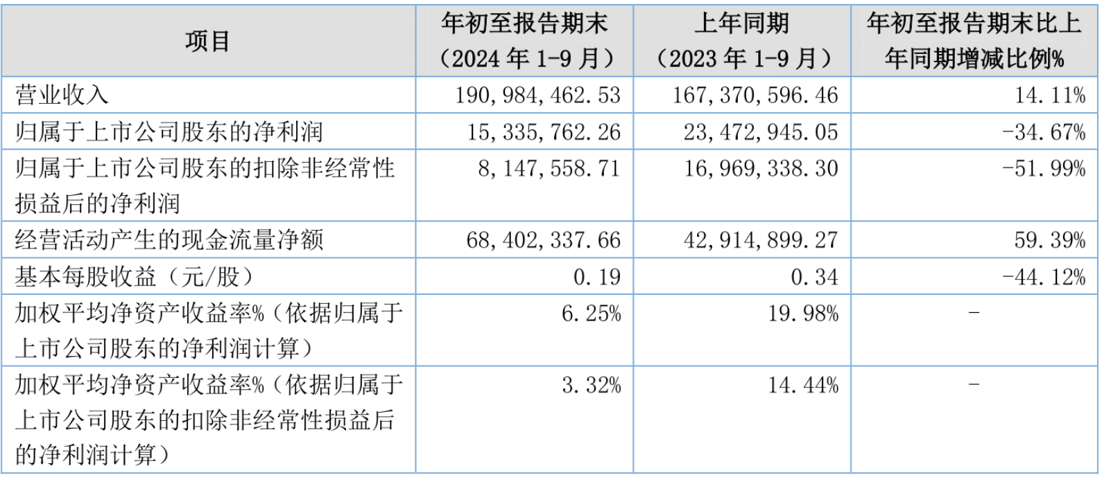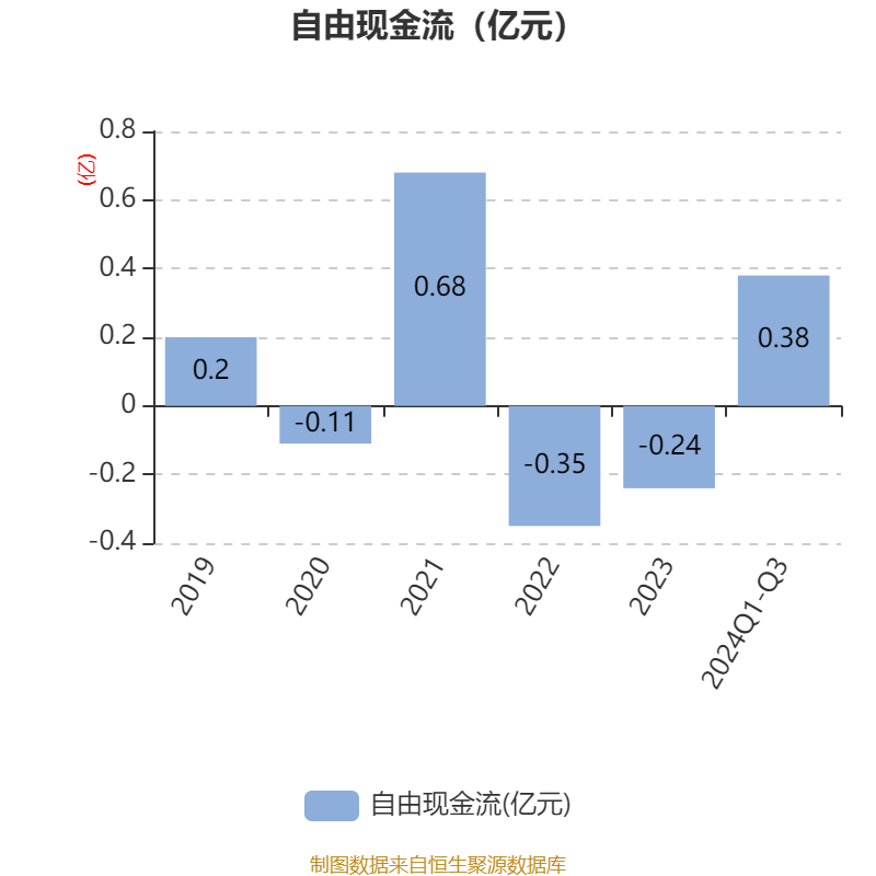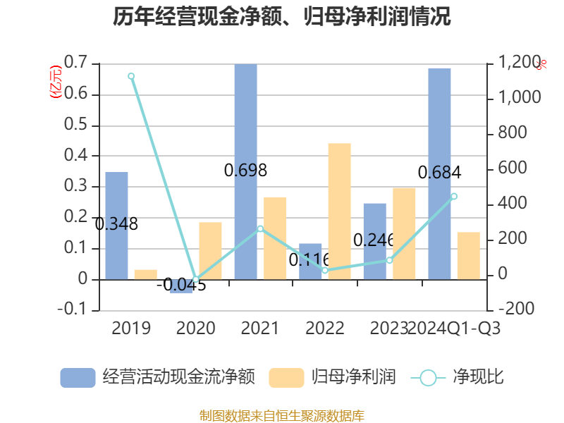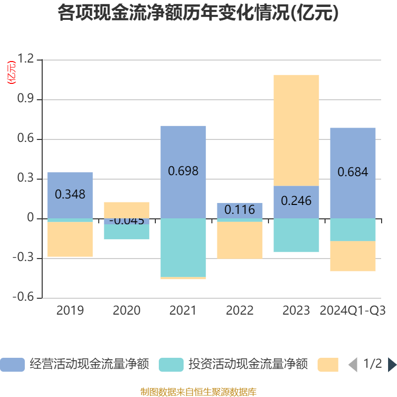 2024年前三季度,公司经营活动现金流净额为6840.23万元,同比增长59.39%;筹资活动现金流净额-2271.4万元,同比减少34.28万元;投资活动现金流净额-1722.82万元,上年同期为-1531.74万元。