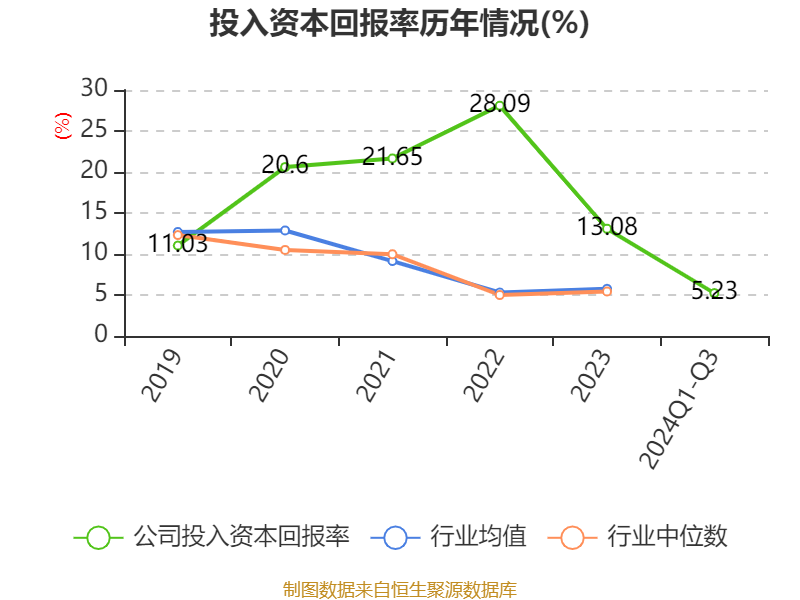 盈利能力方面, 2024年前三季度公司加权平均净资产收益率为6.25%,同比下降13.73个百分点。公司2024年前三季度投入资本回报率为5.23%,较上年同期下降22.93个百分点。