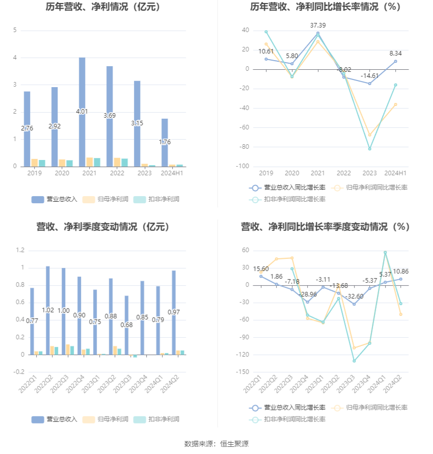 根据半年报,公司第二季度实现营业总收入9730.33万元,同比增长10.86%,环比增长23.92%;归母净利润489.19万元,同比下降50.17%,环比增长110.08%;扣非净利润466.43万元,同比下降31.60%,环比增长102.81%。