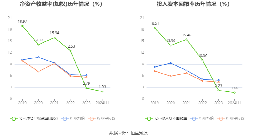 数据显示,2024年上半年公司加权平均净资产收益率为1.93%,较上年同期下降1.01个百分点;公司2024年上半年投入资本回报率为1.66%,较上年同期下降1.02个百分点。