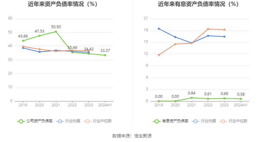 在偿债能力方面,公司2024年上半年末资产负债率为33.37%,相比上年末下降1.05个百分点;有息资产负债率为0.58%,相比上年末下降0.11个百分点。