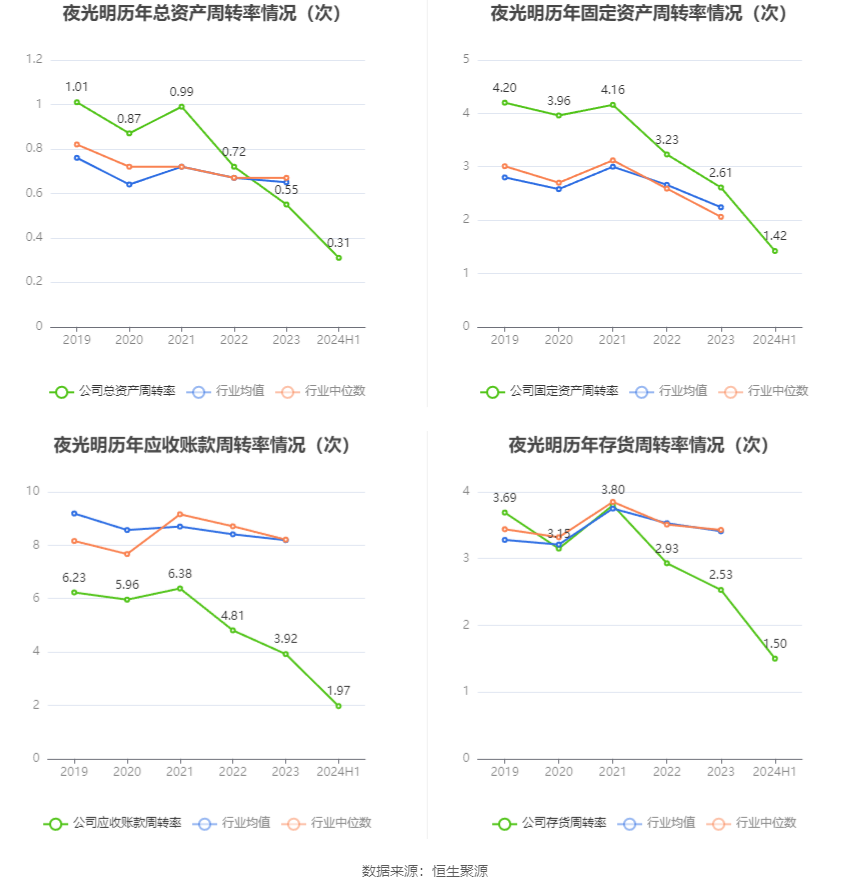 营运能力方面,2024年上半年,公司公司总资产周转率为0.31次,上年同期为0.28次(2023年上半年行业平均值为0.33次,公司位居同行业20/32);固定资产周转率为1.42次,上年同期为1.47次(2023年上半年行业平均值为1.19次,公司位居同行业10/32);公司应收账款周转率、存货周转率分别为1.97次、1.50次。