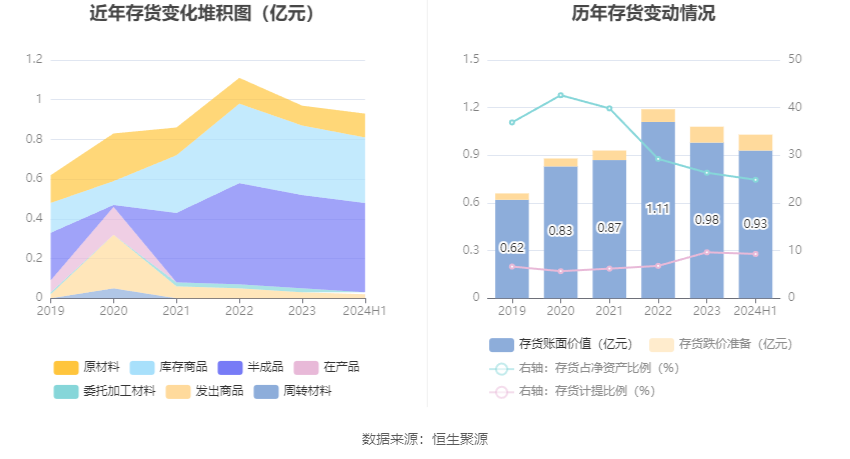 从存货变动来看,截至2024年上半年末,公司存货账面价值为9284.32万元,占净资产的24.86%,较上年末减少491.36万元。其中,存货跌价准备为951.95万元,计提比例为9.3%。
