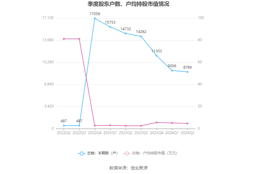筹码集中度方面,截至2024年上半年末,公司股东总户数为8789户,较一季度末下降了217户,降幅2.41%;户均持股市值由一季度末的5.21万元下降至4.73万元,降幅为9.21%。