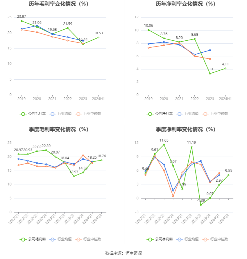 2024年上半年,公司毛利率为18.53%,同比下降0.44个百分点;净利率为4.11%,较上年同期下降2.85个百分点。从单季度指标来看,2024年第二季度公司毛利率为18.76%,同比上升0.72个百分点,环比上升0.51个百分点;净利率为5.03%,较上年同期下降6.16个百分点,较上一季度上升2.06个百分点。